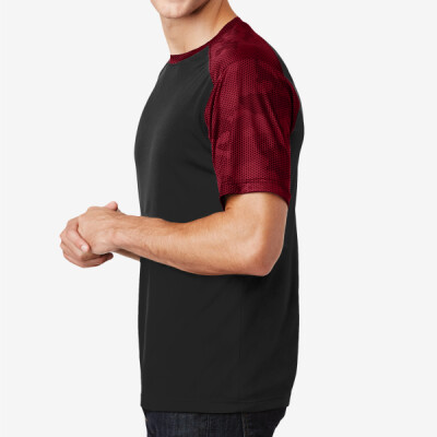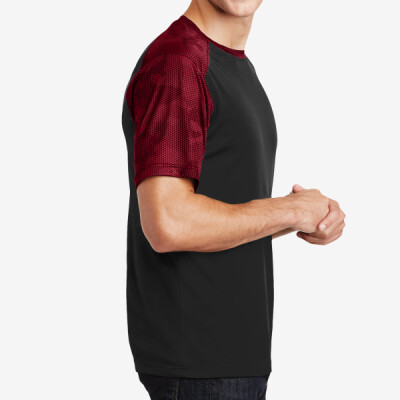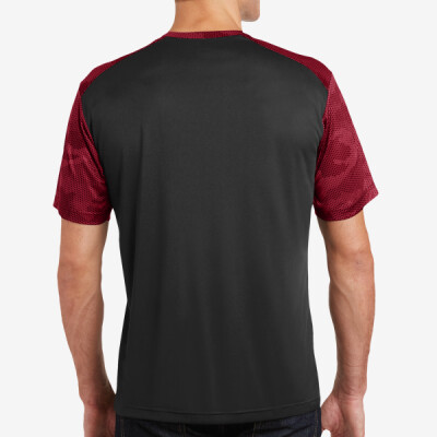 The sublimated digital CamoHex print on the sleeves, shoulders and collar give this moisture-wicking tee a bold, modern look.