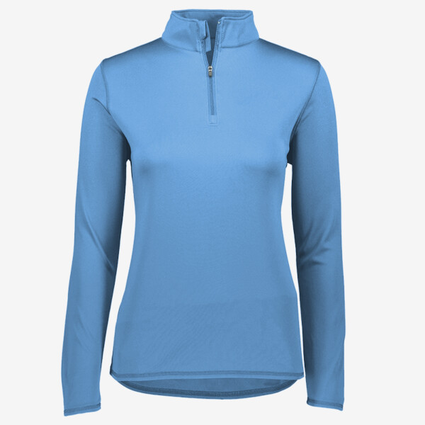 100% polyester wicking knit with true hue technology; True hue technology prevents dye migration; Wicks moisture; Ladies' fit; Tagless label; Quarter-zip pullover style;